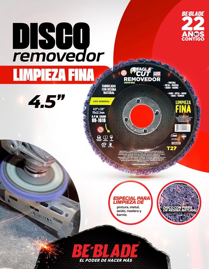 El disco removedor de resina, también conocido como strip disc o disco removedor de pintura, es un accesorio abrasivo diseñado para instalarse en amoladoras angulares o pulidoras.